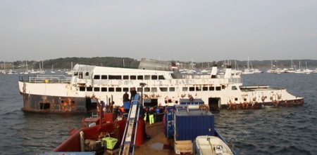 Christiansminde, in den südlichen Fünen und die bereits für die Versenkung aufbereitete Fähre.