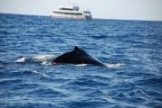 Irgendwann zieht es ihn dann aber wieder hinab zur Mama. Die aber beginnt gerade mit ihrem Aufstieg. Langsam, wirklich ganz langsam kommt der riesige Körper immer näher. Gänsehautfeeling pur. Nur noch ein paar Meter trennen den gewaltigen Kopf von den Schnorchlern. Die Mystik, welche man bei einem tiefen Blick ins große Auge des Wales empfindet und die sanft wirkenden Bewegungen dieses riesigen Tieres hinterlassen einen tiefen Eindruck aus einer Mischung von Achtung und Ehrfurcht vor diesen Geschöpfen. Allein dieser Moment ist die Reise, nein sorry, die Walfahrt wert.Kurze Zeit später atmet das gewaltige Tier aus und es entsteht eine meterhohe Fontäne. Nur zwei leichte Flukenschläge und die Walmutter ist mindestens eine Köperlänge entfernt. Langsam gleitet sie wieder in die Tiefe, gefolgt von ihrem Säugling. Noch zirka 20 weitere Minuten darf die Gruppe dieses faszinierende Schauspiel verfolgen, dann erscheinen zwei paarungswütige Bullen und die Mutter mit ihrem Kalb sucht das Weite.