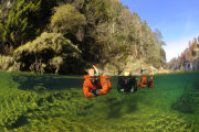 Ist ober- und unterhalb der Traunfälle möglich. Besonders schön sind Touren, die an die glasklaren Quelltöpfe anschließen. Kilometerlang kann man den Fluss und die Auenlandschaft rechts und links genießen. Im Fluss gibt es viel zu sehen: Flusskrebse beispielsweise, oder ganze Schwärme von Barben, welche mit ihren Barteln im Flussgrund nach Nahrung stöbern. Die Begegnung mit den scheuen Huchen ist etwas ganz besonderes. Ein riesiges Exemplar lässt sich regelmäßig, aber nur kurz blicken! Scuben mit den Tauchbasen ist ein "rundum-sorglos" Paket: Man wird an den Einstiegspunkt gefahren und am Ausstieg wieder abgeholt. Die Guides kennen die Traun perfekt und wissen, wie man Engstellen und Stromschnellen gefahrlos meistert.