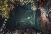 Im Bereich der Aufbauten findet man dann neben farbenfrohen Nacktschnecken auch Ausrüstungsgegenstände, die von der Besatzung stammen. Weinflaschen. Stiefel. Eine Rettungsweste mit dem Namen des Schiffes. Wer noch genauer hinsieht, stößt auf im Sediment verborgenes Geschirr, Besteck und Marmeladengläser – ein sicheres Indiz dafür, dass die Turkia bislang vor größeren Plünderungen geschützt war. Ebenso der Maschinenraum: Mit seinen vielen noch vorhandenen Details gleicht er einem Unterwassermuseum über die Zeiten der industriellen Revolution.