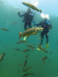 Nähern sich Taucher der Plattform, bedeutet das Essenszeit. Hektik kommt in die Unterwasserwelt sobald Fischfutter ausgestreut wird. Aus allen Himmelsrichtungen strömen die Fische herbei! So hautnah kann man Forellen und Saiblinge sonst nie beobachten. Wenn alles Futter aus dem Döschen gefressen ist, kehrt langsam wieder Ruhe um die Plattform ein. Bis die nächsten blubbernden Taucher kommen und bereits erwartet werden. Mahlzeit!