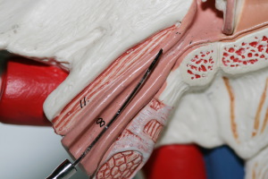 Schema des Eingriffs: Der noch nicht aufgeblasene Katheter in der Ohrtrompete am Ohrmodell (rechts in Nahaufnahme).