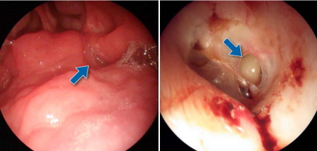 Links: Blick in den Nasenrachen. Der Pfeil zeigt auf den Eingang der Ohrtube.