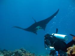 Ein Tauchgang welcher sehr große Erwartungen weckte, war der am Mantapoint. Im Gegensatz zu anderen gleichnamigen Plätzen, die ihre Namensgebung wohl in grauer Vorzeit erwarben, sollte hier der Name Programm sein. Von oben sah der erste Versuch am Mantapoint zunächst nicht so hoffnungsvoll aus. Die Schnorchelboote tuckerten kreuz und quer auf der Suche nach Mantas, aber keines schien einen Kontakt zu haben. Dennoch wurde mit dem Tauchgang nach einer halben Stunde abwarten begonnen, im kleinen Beiboot war es auf Dauer eben doch zu warm.