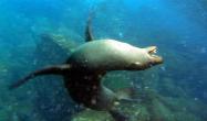 Ganz im Gegensatz zu Ihrem Verhalten an Land müsste man Seelöwen unter der Meeresoberfläche als Clowns bezeichnen: sie schleichen sich von unten an uns Taucher an, umrunden uns neugierig, verstecken sich hinter einem Stein, um dann wieder direkt auf uns zuzuschießen, fingerbreit vor dem Gesicht abrupt abzubremsen und bellend einen Schwall Luftblasen auszustoßen, auftauchen um zu atmen, und das Spiel beginnt von Neuem.