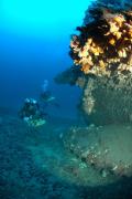 Drei Meilen vor der Küste ist Scherrer diesem Traum nun ganz nah gekommen. Ein Sprung vom Boot noch, dann schlägt das Wasser klatschend über ihm und den anderen Tauchern zusammen. Auf den ersten zehn Metern sammeln sie sich, auf dreißig Meter Tiefe ist der Druck des Wassers schon doppelt so groß wie der Druck in einem Autoreifen. Der Blick der Gruppe fällt suchend nach unten: Langsam zeichnet sich auf dem 57 Meter tiefen Sandgrund ein dunkler, zigarrenförmiger Körper ab.
