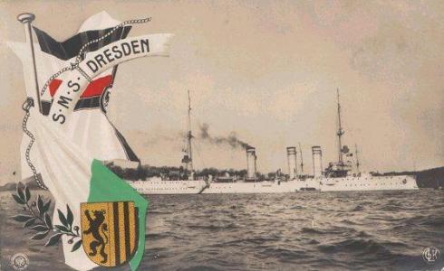 Die 1909 bei Blohm&Voss in Hamburg erbaute SMS Dresden gehörte ursprünglich zum Ostasiengeschwader der Kaiserlichen Flotte. Bei Ausbruch des 1. Weltkrieges befand sich dieses auf See fern der Heimat und lieferte sich später mit Verbänden der Royal Navy bei den Falkland-Inseln eine denkwürdige Seeschlacht. Hierbei entkam die SMS Dresden als einziges Schiff. In den folgenden Monaten spielte sie mit der Royal Navy Katz und Maus und schlug der britischen Marine im Inselgewirr Patagoniens so manches Schnippchen -nicht zuletzt Dank der Spezialkenntnisse des Deutsch-Chilenischen Lotsen Albert Pagels. Am 14. März 1915 verfügte das zu diesem Zeitpunkt vor der chilenischen Pazifikinsel Juan Fernandez ankernde Schiff kaum noch über Munition und hatte mangels Kohlen auch keinen Dampf mehr auf den Kesseln, als es von britischen Flotteneinheiten aufgespürt und unter Beschuß genommen wurde. Damit sein Schiff nicht in feindliche Hände fiele, befahl daraufhin der Kommandant der SMS Drsden, Fregattenkapitän Fritz Lüdecke, sein Schiff selbst zu versenken -was auch geschah. Die Mannschaft ging in die chilenische Internierung und richtete sich dort so gut ein,daß auch nach dem Krieg über ein Drittel der 300 Mann starken Besatzung dort blieb, weshalb auch heute noch in der Gegend viele deutschstämmige Familien leben. Das Wrack ist heute chilenisches Nationaldenkmal. Nur aufgrund der Mithilfe der chilenischen Marine konnte die Bergung der Glocke stattfinden. Diese soll später eventuell als Ausstellungsstück nach Deutschland kommen. Die rund 200kg schwere und ca. 80cm Durchmesser aufweisende Glocke ist sehr gut erhalten. Man sieht deutlich den preußischen Hoheitsadler, den Schiffsnamen und die Eichenlaubverzierungen auf ihr.