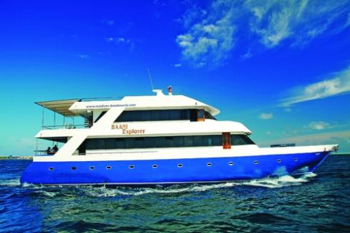 30 Meter lang und 8,5 Meter breit: Die "M/Y Baani Explorer" ist nicht nur eines der bekanntesten Safarischiffe auf den Malediven, sondern bietet mit dem ENOS®-System moderne Sicherheitstechnik für Taucher.